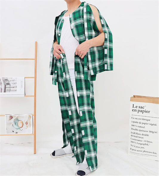 Men Patient Checked Pajamas Suit Fully Open Sticky for Paralysis Fracture Health